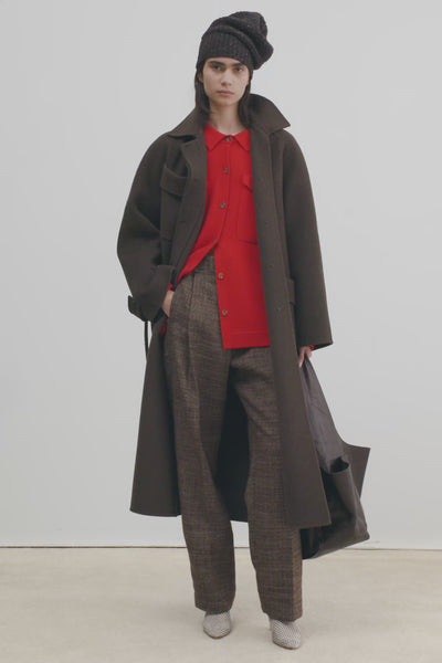 Classic trench cut from ultra-soft, finely spun wool. Features a slightly off-kilter front patch pocket, as well as two hip pockets and a self-tie belt for a customizable fit.