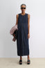 Sleeveless midi dress cut from structured Classic Odisto denim. Features a round neckline, a straight silhouette, side seam pockets, and a back zip closure. The dress is finished with contrasting front and back seam details and a center slit for ease of movement.