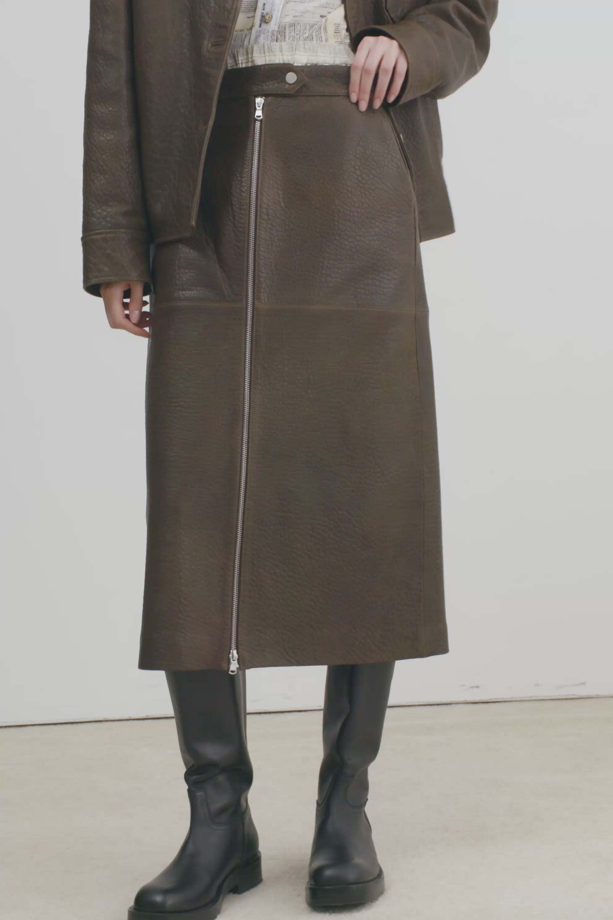 Midi skirt cut from buffalo leather. Features a striking contrasting two-way zipper and a snap tab closure. Layer another skirt underneath for a dimensional look.