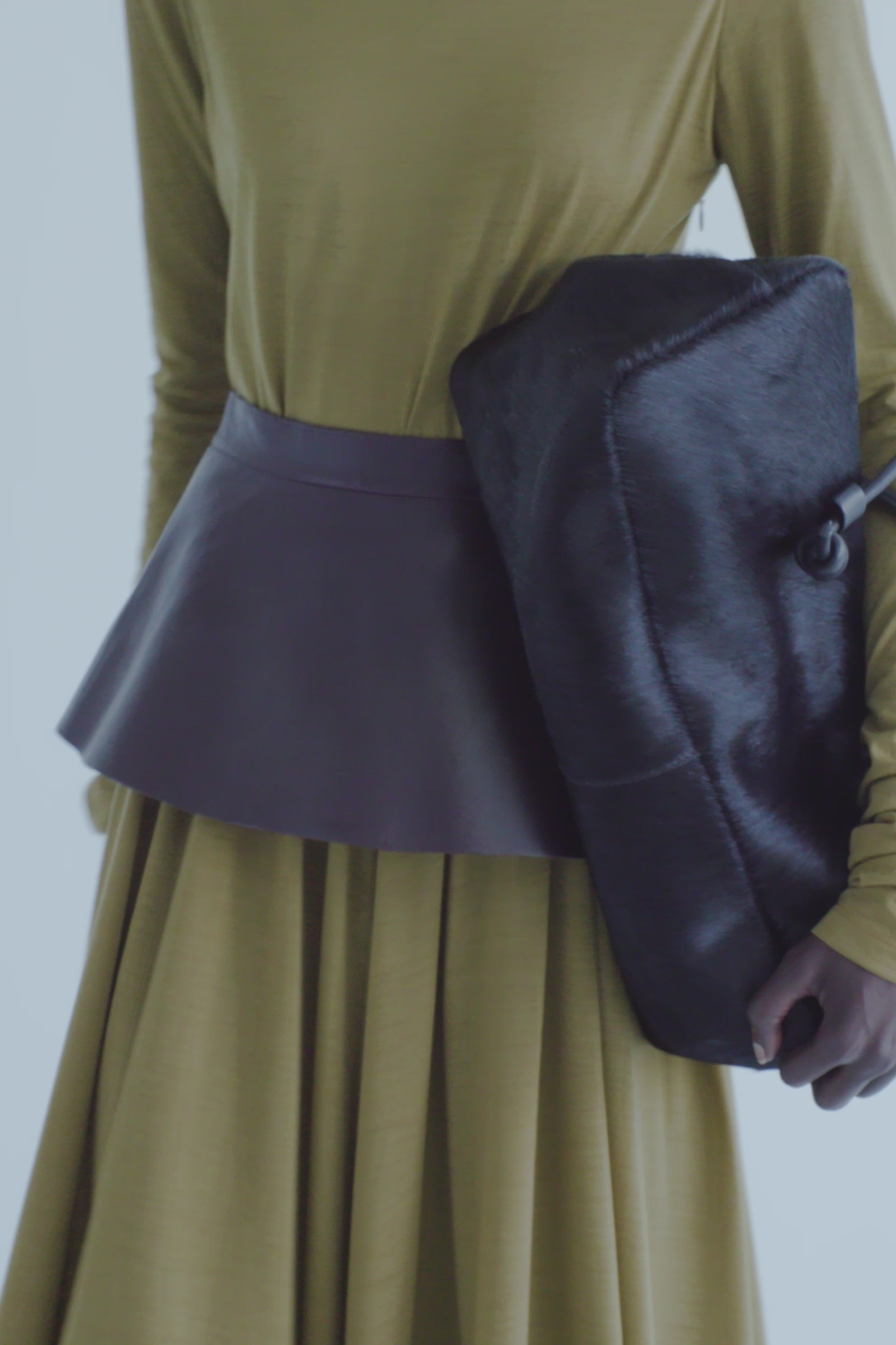 Our take on a duffle bag. Structured, with a boxy silhouette. Features two tubular leather top handles, an adjustable and detachable shoulder strap, and a zip closure with a long leather zipper pull.