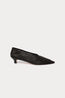 Pointed-toe kitten heel with a perforated triangular design on crinkle patent leather that conforms elegantly to the foot.
