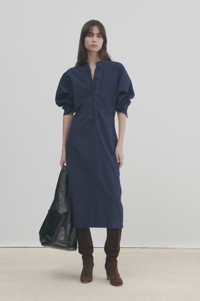 Mid-length denim shirtdress with a band collar, dolman sleeves, and a front button closure. Features button detailing and vent at the back of the skirt.