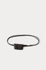 Slim, double-wrap belt crafted from structured leather. Features a removable angular pouch with a snap closure. Adjustable length with a custom buckle inspired by a fishing hook.