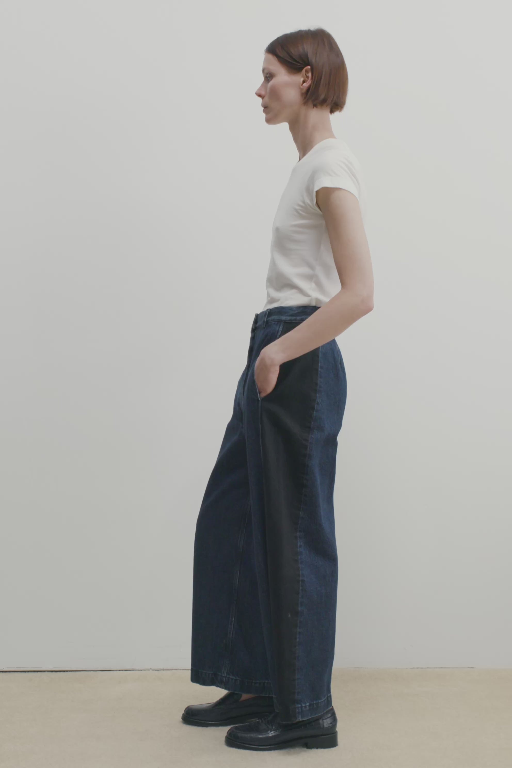 The Garra Pant is a high-waisted, flat-front, relaxed fit jean with a wide, rounded leg, cut in our classic two-tone Mission Combo Denim. Contrast denim side panels elongate the silhouette. Our denim collection is made in Los Angeles using premium Japanese denim.