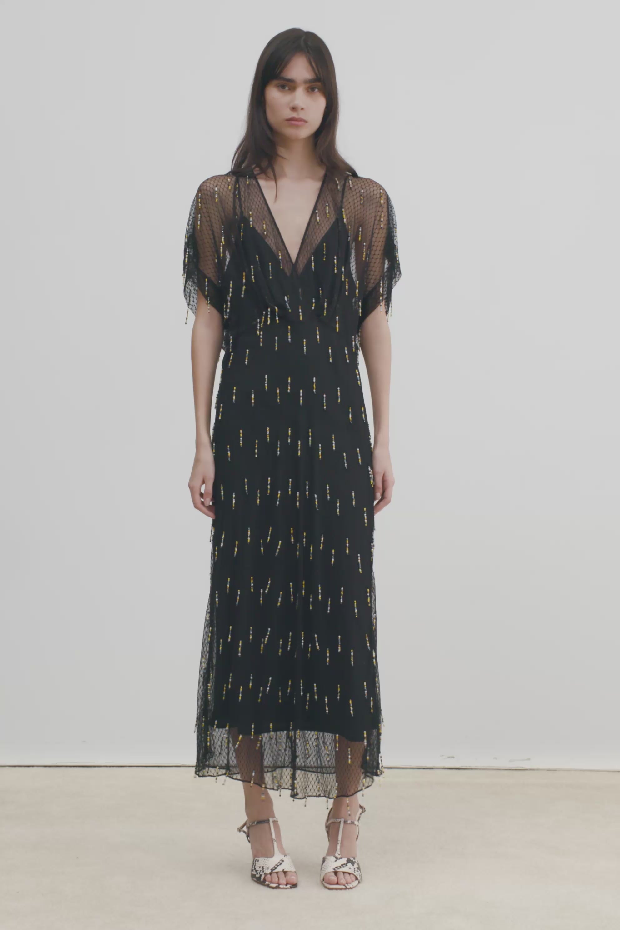 Flowing mid-length dress with a deep V-neckline and short flutter sleeves, crafted from a bead-embellished mesh. Features a cinched waist and a self-tie back. Beautiful for occasions.
