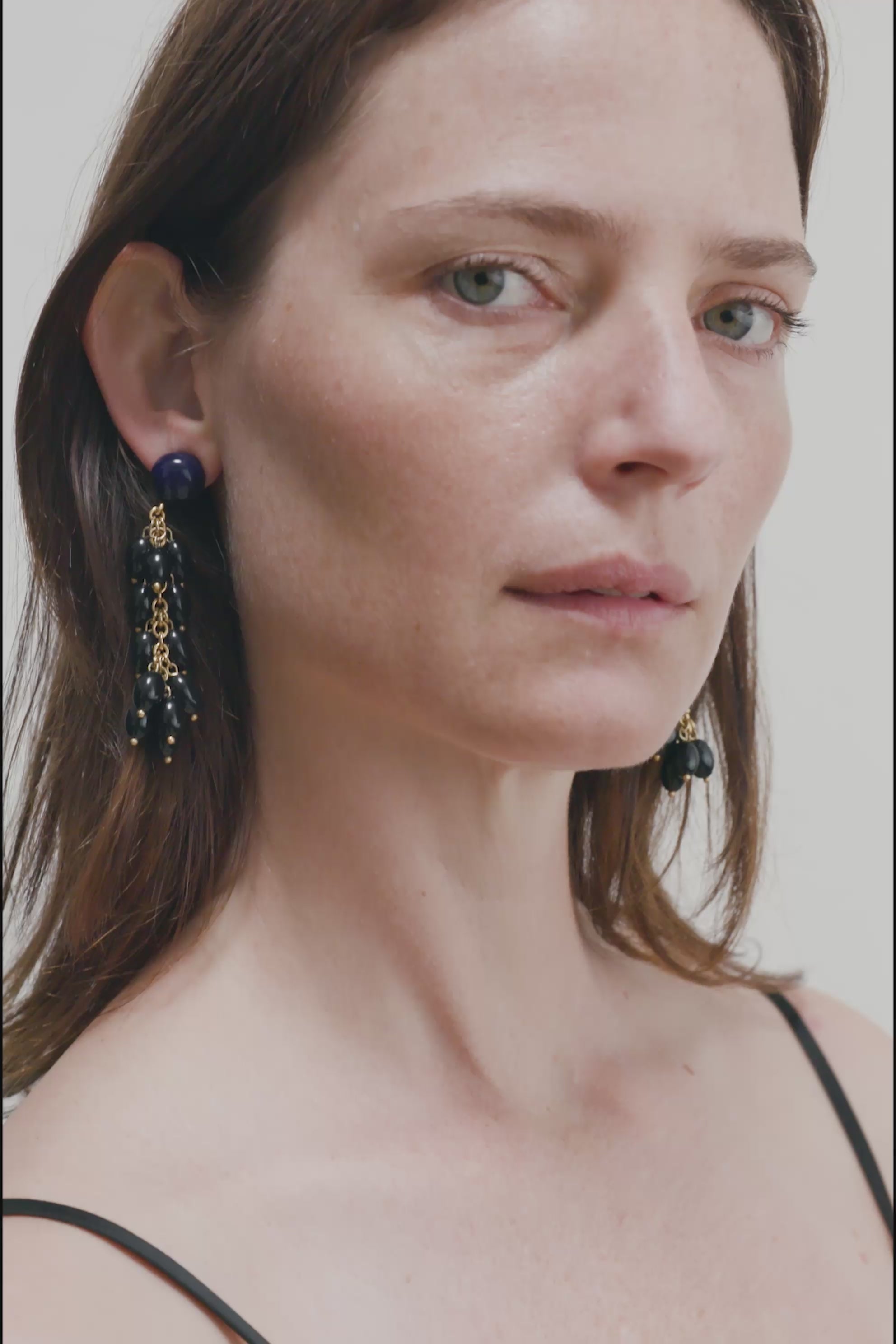 Drop earrings featuring layered acrylic beads suspended from gold-tone chains. Designed for subtle movement. Sold as a pair.