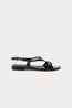 Flat, crinkle patent leather open-toe sandals with an ankle strap with a buckle closure.