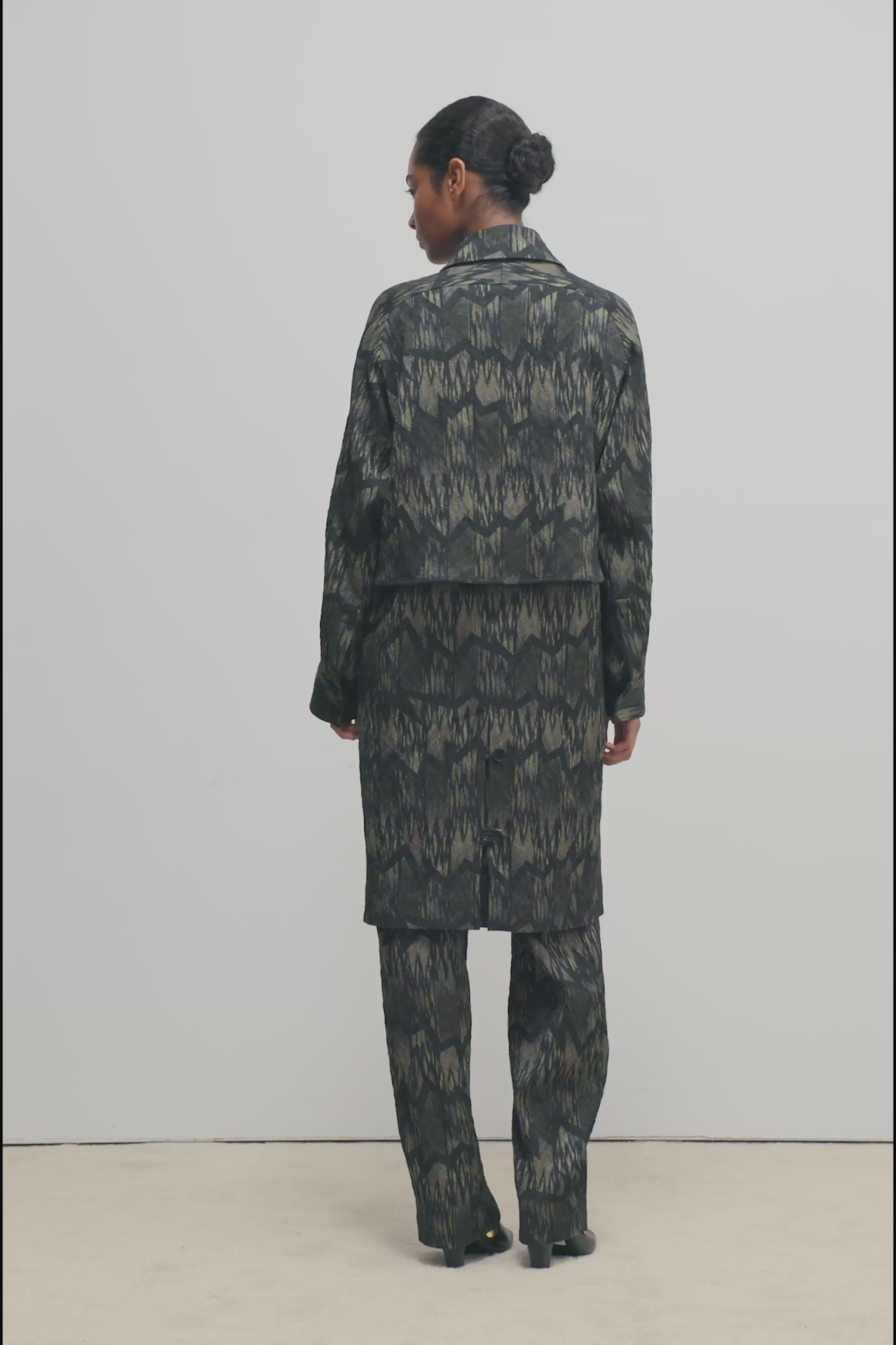 Long single-breasted coat cut from matelassé fabric with a softly quilted texture and dimensional depth. Digitally printed with our custom Ziggy motif for a modern interpretation of classic pattern work. Designed with a straight silhouette and light structure, ideal for layering.