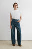 High-waisted wide-leg pant with a clean silhouette, fitted through the waist and hip with a slight crop. For fans of the Bishop and Legion pant. Our Washed Salinas Denim is a faded black Japanese denim with subtle distressing that opens up and softens with wear.