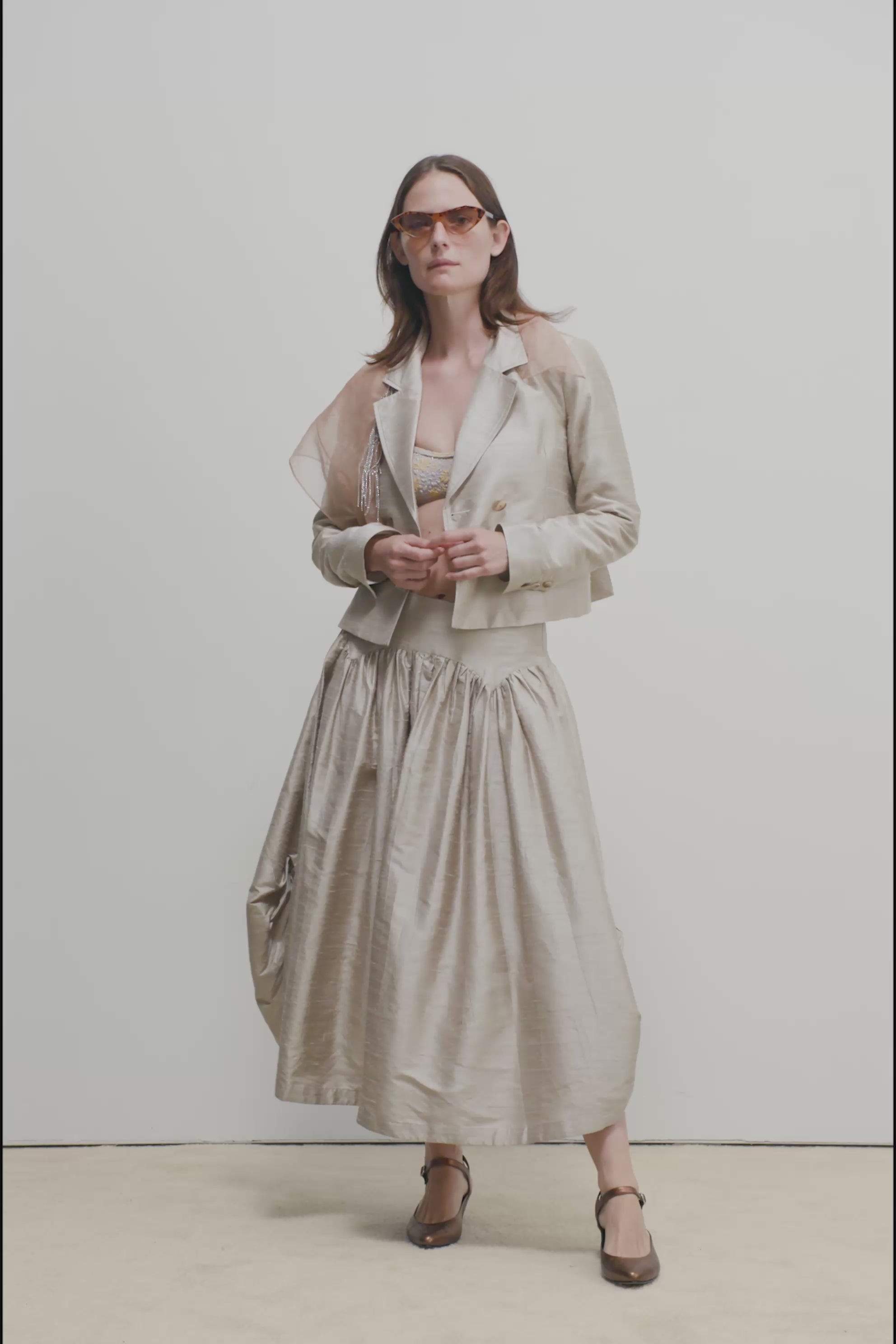 Full midi skirt cut from handwoven Mulberry Shantung silk with a rich, slightly slubby texture and natural luster. Designed with a sculpted waistband and soft gathers that create natural volume through the skirt. Crafted in partnership with a third-generation, family-run studio, where each fabric is woven by hand using traditional techniques. Wear with the Sainz Blazer for a striking coordinated set.