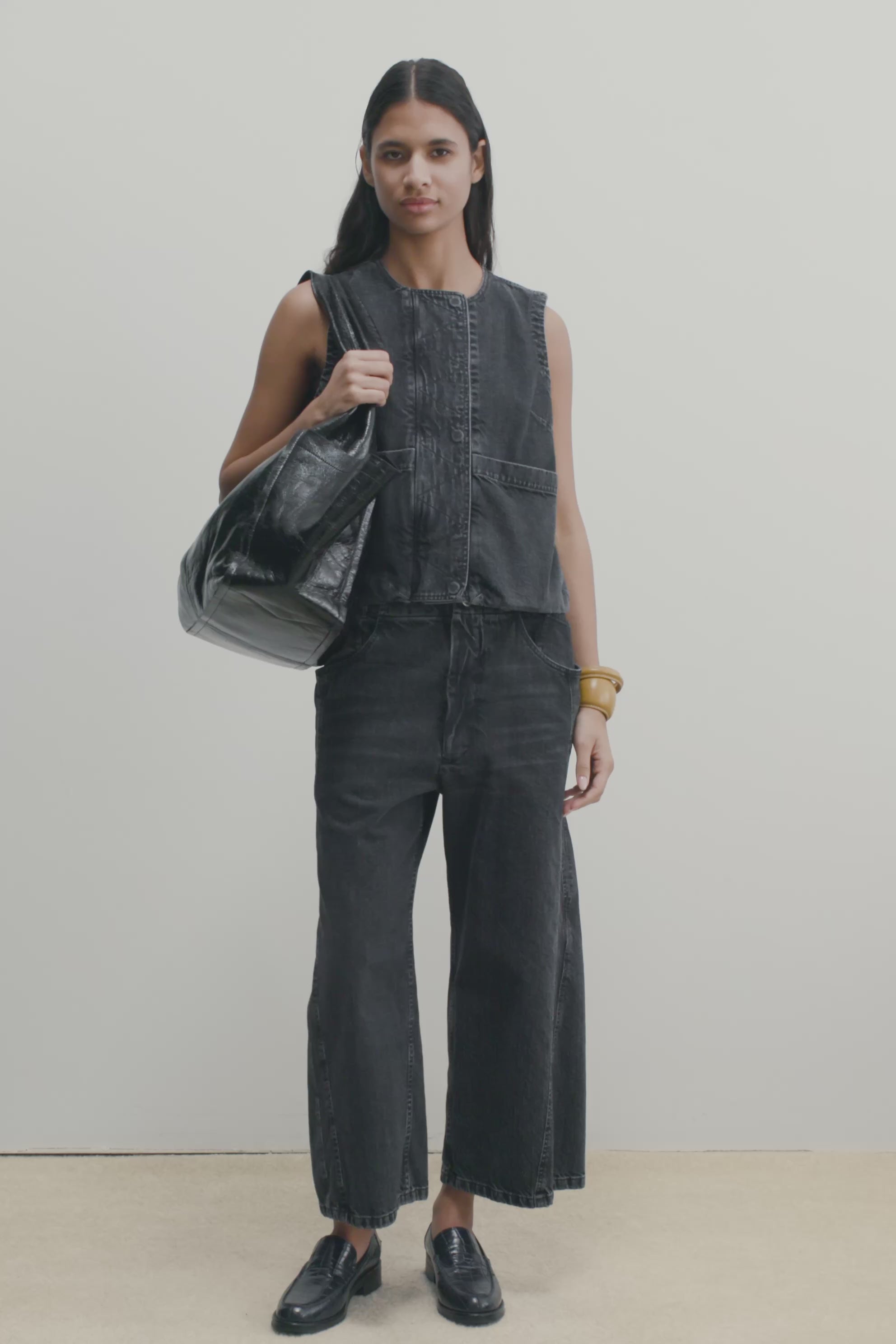 Sleeveless top cut from our washed Salinas Denim. Features a round neckline and a concealed front snap placket. Designed with two front patch pockets for utility and a versatile, boxy silhouette suitable for everyday wear.