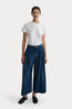 Flowy, wide-leg, high-waist cropped pant with a slightly gathered waist, in indigo Raw Vista Denim.